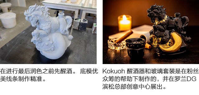 作为佐贺县鹿岛市的Mitsutake Sake Brewery和《北斗神拳》出版商Coamix Inc.的合作项目之一,我们制作了一个红薯烧酒器和玻璃套装,其特点是 "Kokuoh",即流行人物Raoh的泰坦黑马。我们收到了Mitsutake Sake Brewery的生产请求,该公司正在寻找一个能够按照他们的设计生产瓶子的陶工。脸部和身体彩绘艺术家Amazing JIRO根据漫画的动画导演和田拓也绘制的设计草图,制作了酒瓶的外形。为了确保生产的瓷器与3D数据中的一模一样,我们通过反复试验选择了正确的材料和烧制温度。在白色材料上涂抹黑色釉料的传统方法最终会压坏底模的复杂线条,所以我们在黑色材料上涂抹透明釉料。这是我启动224项目以来最具挑战性的项目之一,但我通过将我多年的艺术经验与数字技术相结合,成功完成了这套酒器。我个人觉得,我创造了一件真正的艺术品。