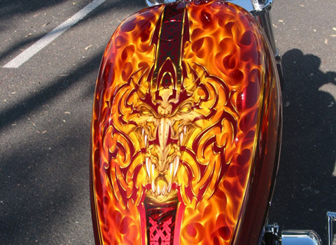 Mike Learn, of Mike Learn Airbrush & Design, knows airbrushing. In addition to winning the prestigious V-Twin Painter of the Year Award, Learn has painted Kendall Johnson’s Easyrider Centerfold Tour bike, the JNC Shootout bike, Death Valley Choppers’ Las Vegas bike and Anna Nicole’s TrimSpa bike, just to name a few. The airbrushing veteran has even created many fine-art pieces, vehicle graphics and album covers, including the latest Megadeth release, The System Has Failed.