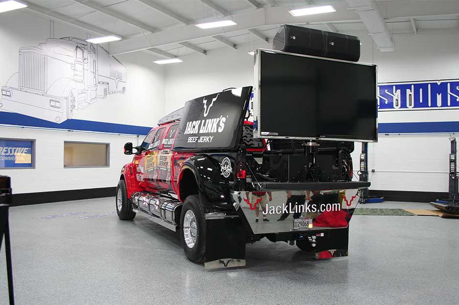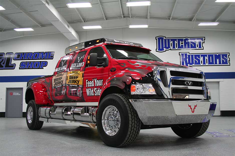 Another job shown on Season One of the show was a truck customization for Jack Link's Beef Jerky. The truck was brought in painted in an unattractive orange color. Outcast Kustoms did a partial paint job on the truck, and then installed vinyl graphics showing the product packaging and the company's logo.