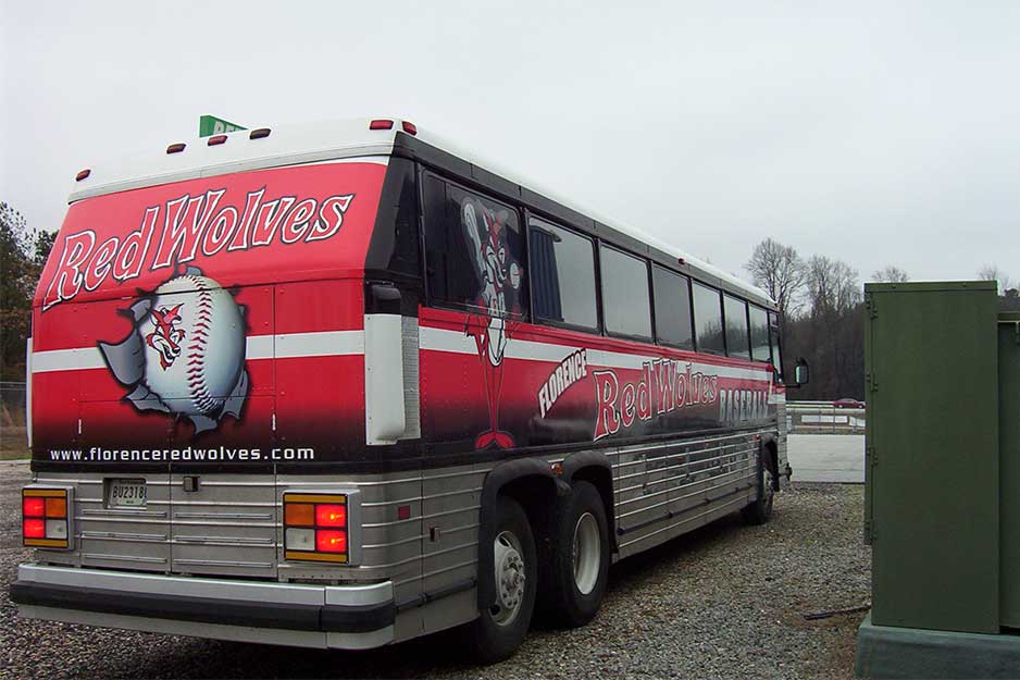 Outcast Kustoms also customized a bus for its local summer league baseball team, the Florence RedWolves. The bus provides transportation and advertising for the team, with graphics showing the team logo on the sides and back of the bus, and a wolf image printed on window perf media and installed on the windows. "That wrap was done in 2003 and still looks great today, in spite of sitting outside in the South Carolina heat," said April.