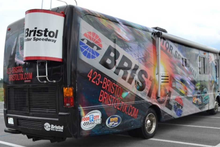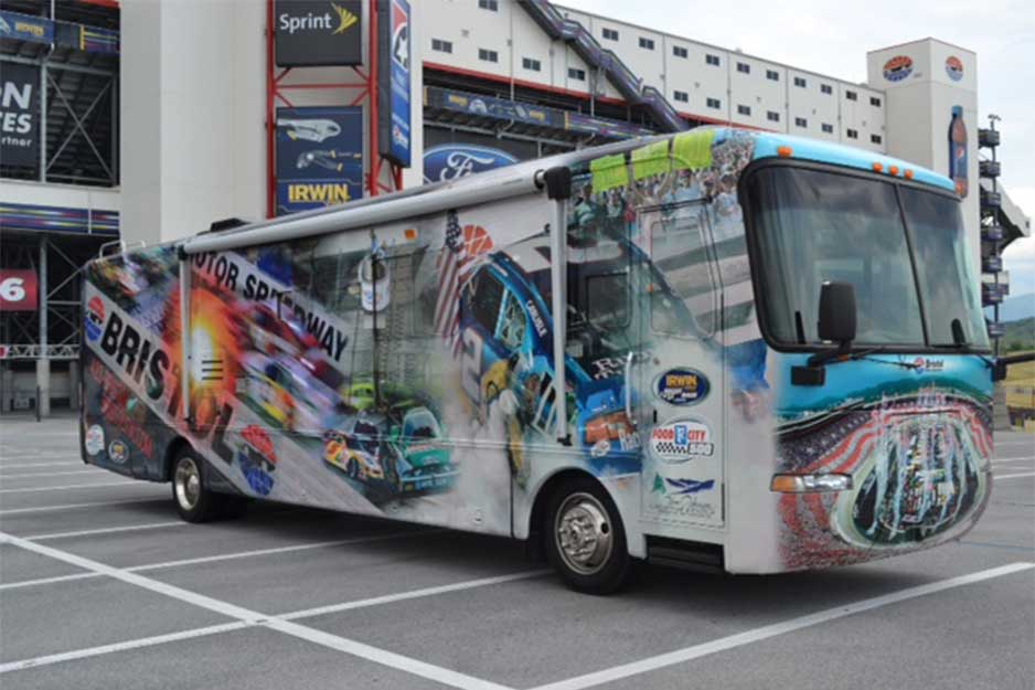 Among Outcast Kustoms' biggest wraps was a 43-foot long RV wrapped inside and out for the Bristol Motor Speedway. The RV project concept was to create the ultimate Bristol Motor Speedway fan experience.