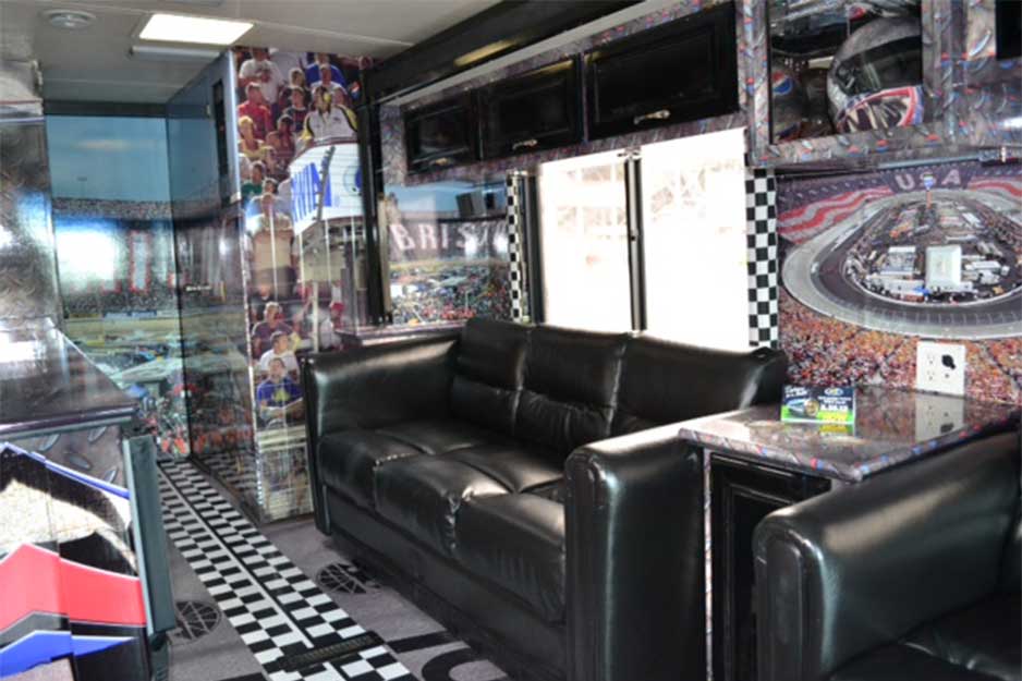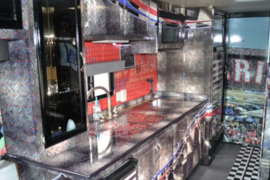 Customized touches inside the RV include a replica of the Speedway's flag stand and graphics representing drag strip towers. The kitchen area is wrapped to look like a team pit box, and along the back wall of the interior is a nostalgia collage of reprinted photos.