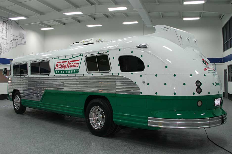 The exterior graphics show highlights from the history of Bristol Motor Speedway and Bristol Dragway. On the front of the RV is an image of the track in daytime, while the back shows an image of the track at night. To produce all the needed graphics, Outcast Kustoms ran their SOLJET for 36 hours straight.