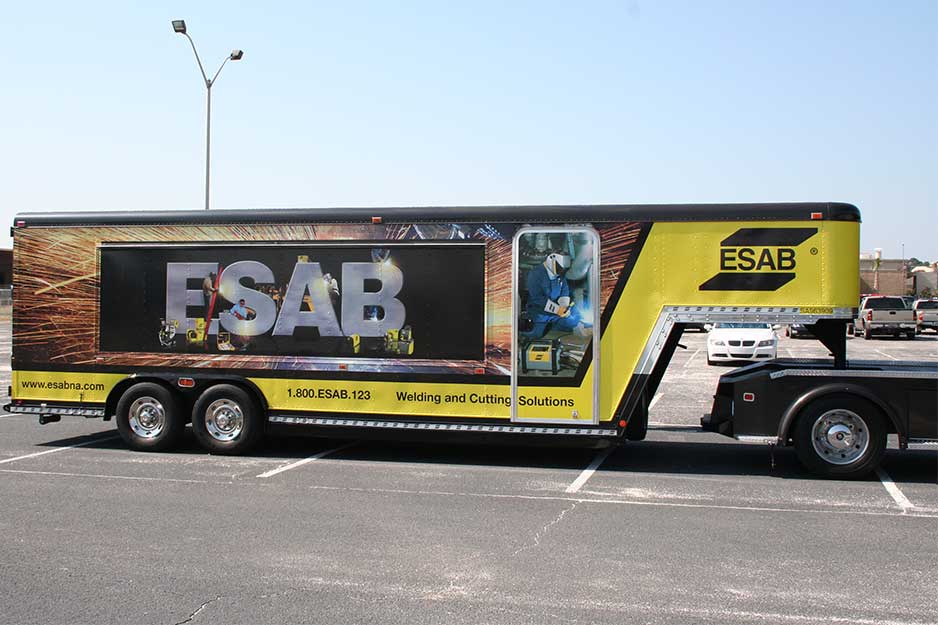 Another large customization job on the show included creating and installing yellow and black wraps for ESAB trucks and trailers as part of a branding effort by the company.
