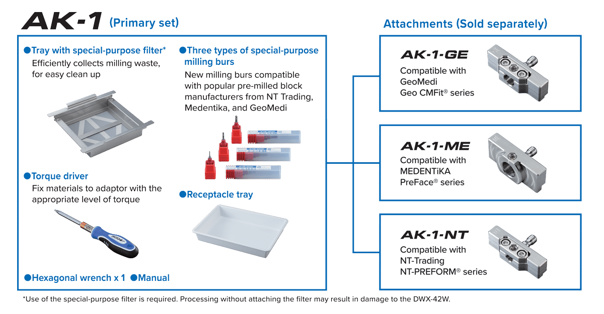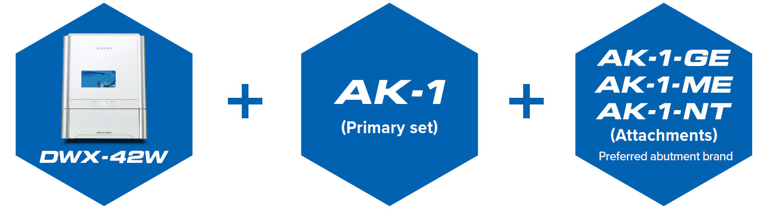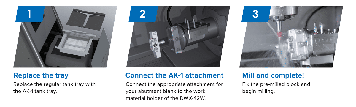 When switching to custom abutment processing, simply replace the filtration tray and connect the AK-1 attachment. Your CAM software handles the rest.