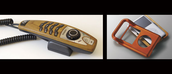 左:使用木材、ABS和铝零件利用MDX-540制作的手机原型