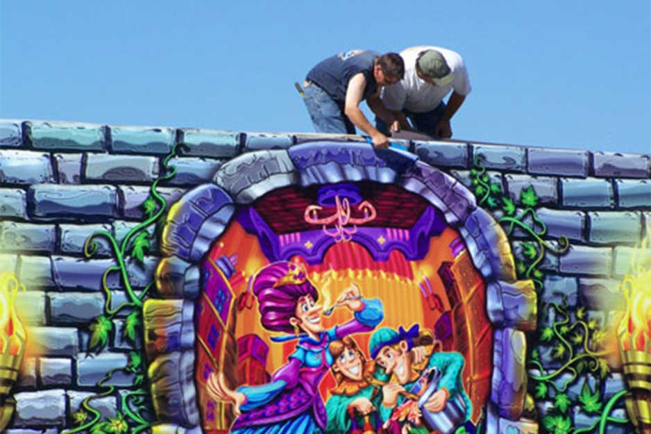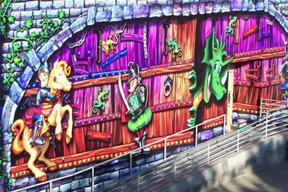 Craig and his team in upstate New York worked with Kid’s Castle’s owners for seven months to develop an array of 50 characters and create bright, oversized graphics that complemented the facility’s medieval theme. To accurately plan the placement and content of the murals, M.T.T.S used computerized architectural drawings and 3D software to extrude the walls, creating a virtual image of the facility. This technology allowed them to “walk around” the yet-to-be-built building to determine the optimal use for each wall space.