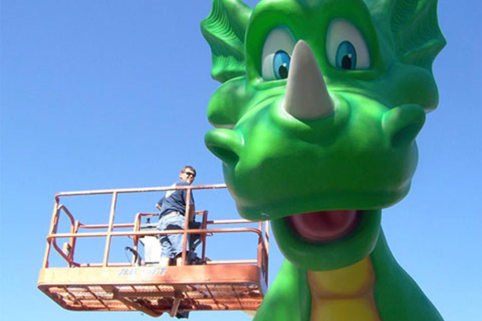 For the exterior of the building, M.T.T.S. designed a 200-foot wall mural as well as a 14-foot 3D dragon, which was wrapped and mounted on the roof. While the wall and dragon were being installed, kids and parents playing at the field opposite the building came to the construction fencing to ask about the facility, creating the kind of anticipatory buzz marketers dream about.